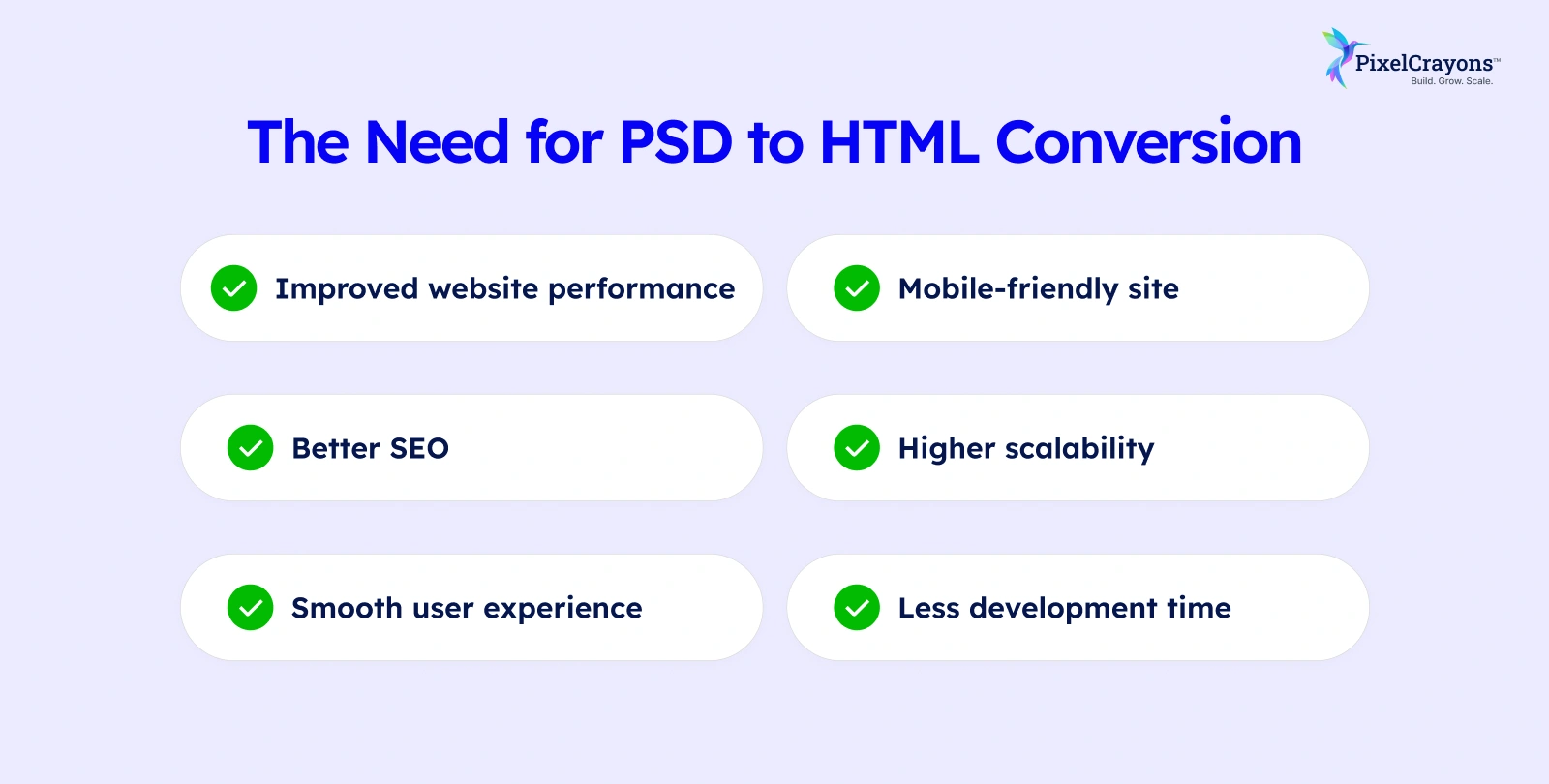 Outsourcing your PSD to HTML conversion project to PixelCrayons provides many benefits, such as: